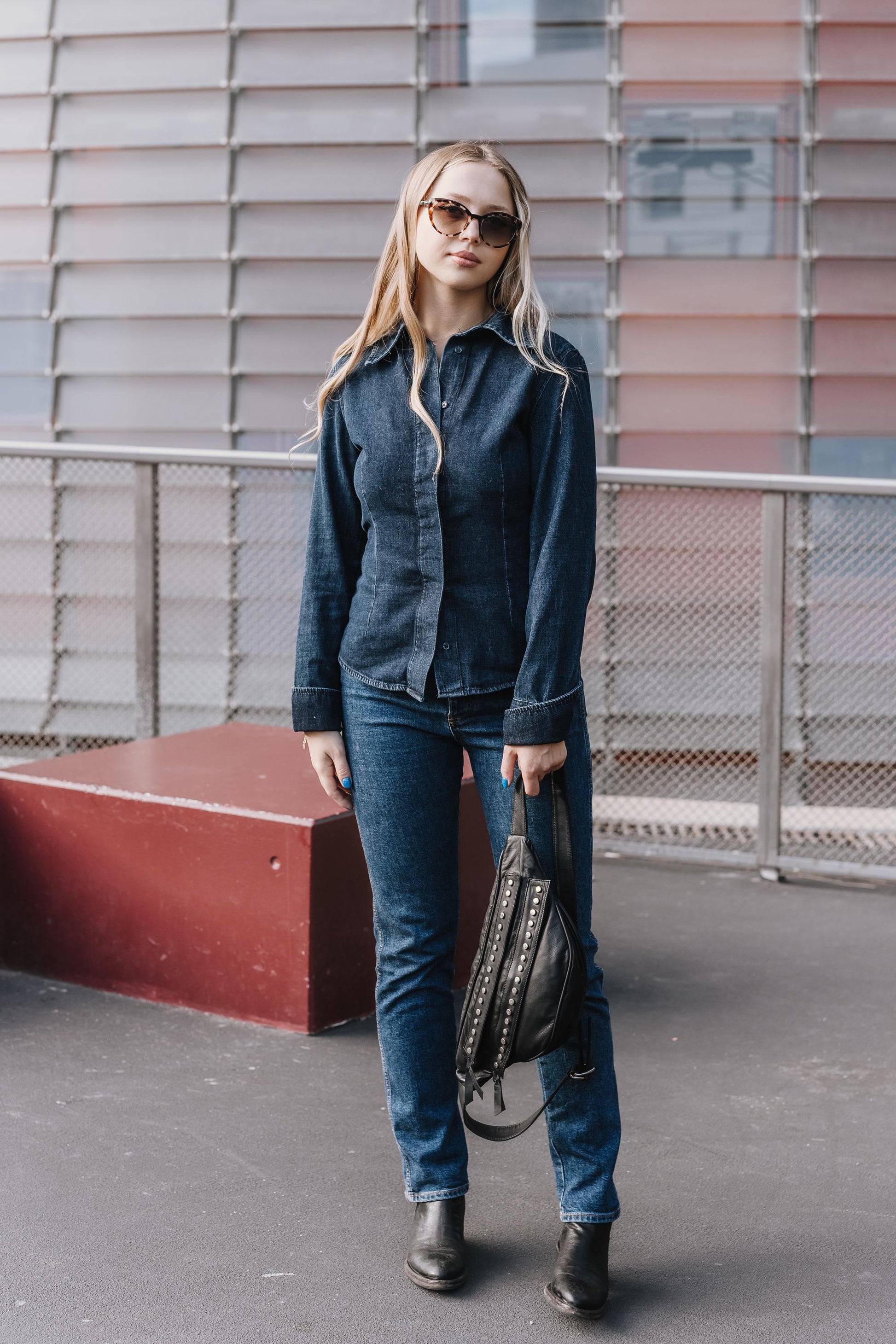 Small black leather sling bag with metallic studs for a bold, modern look. Compact, soft, and perfect for concerts, city life, or daily wear.