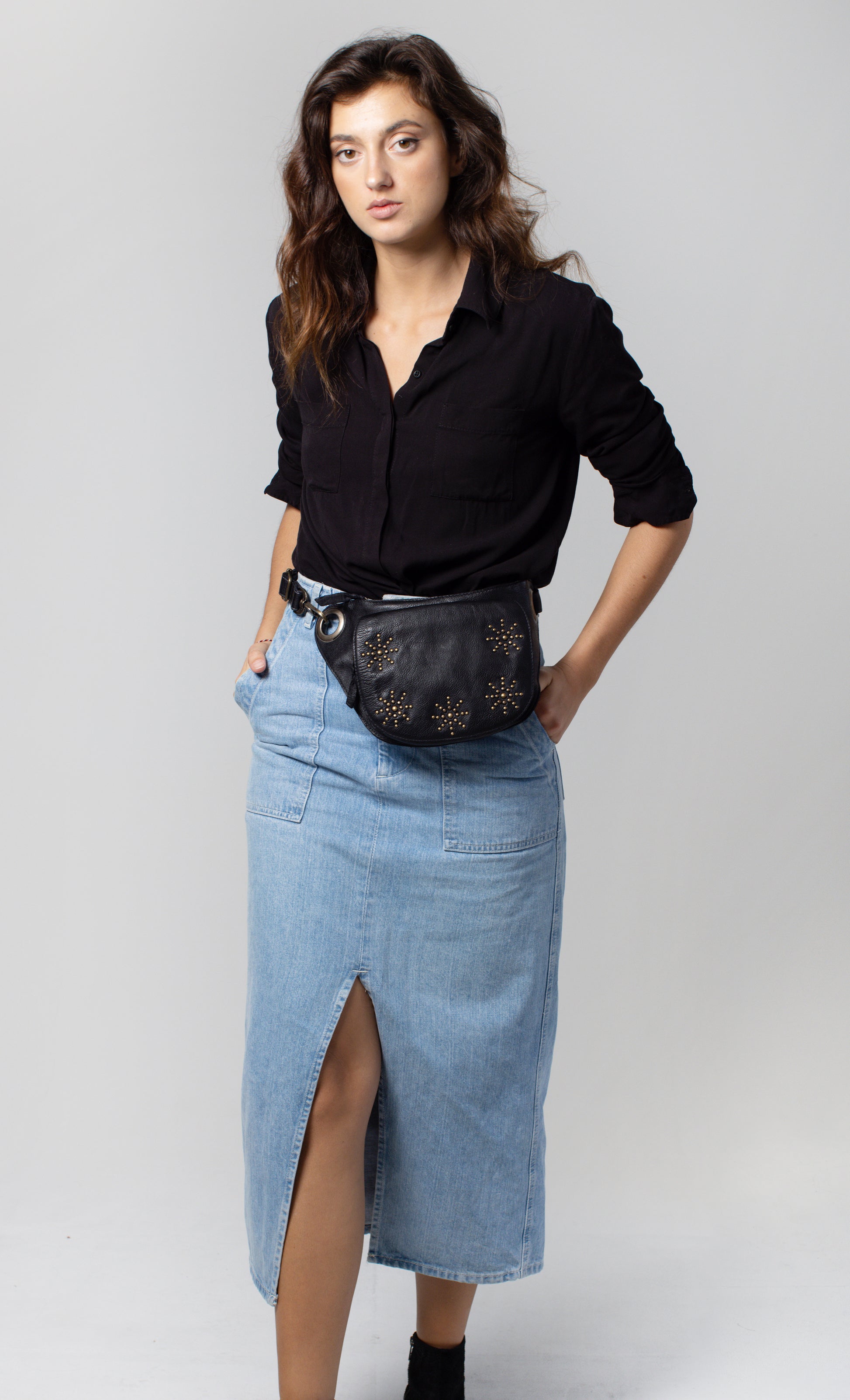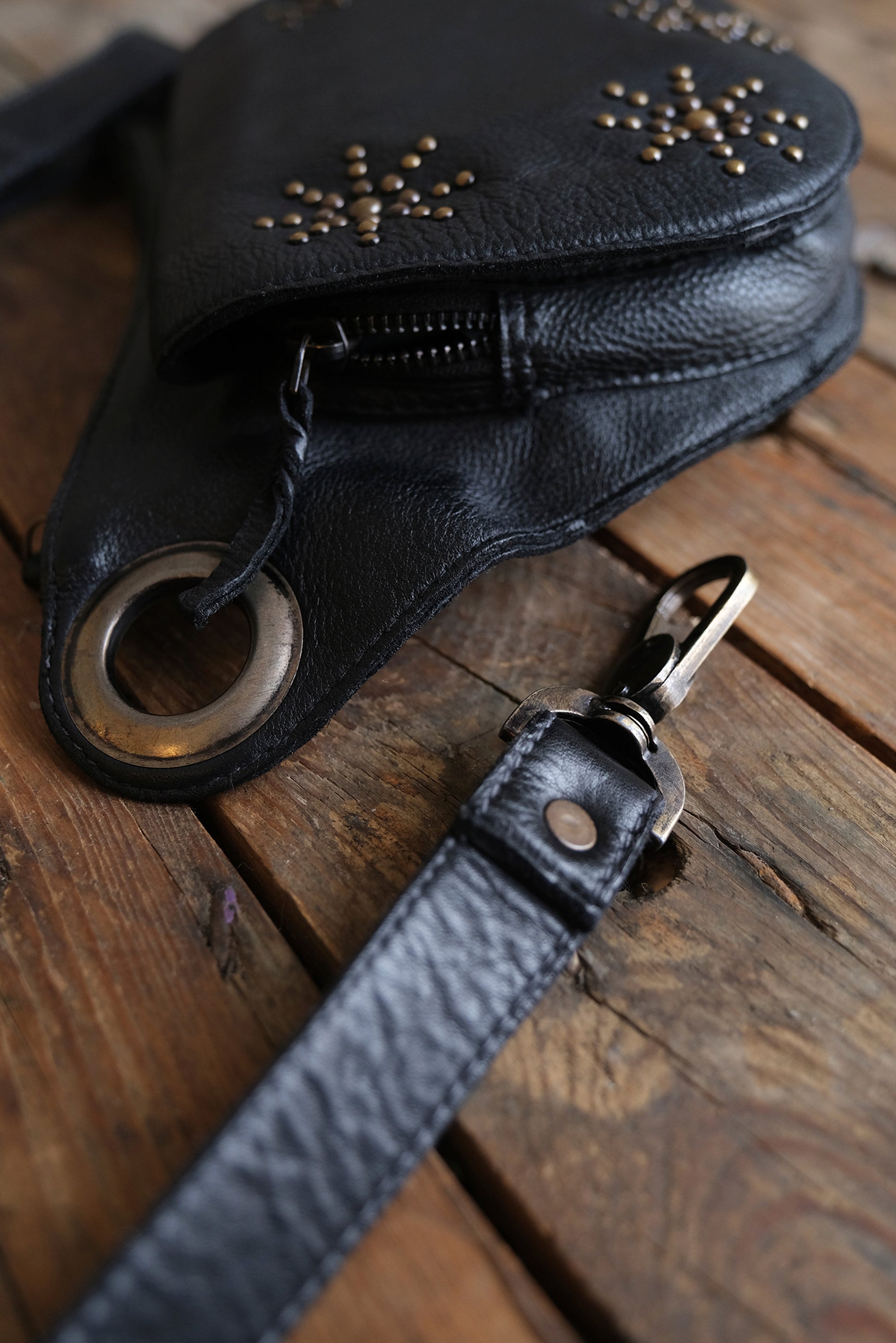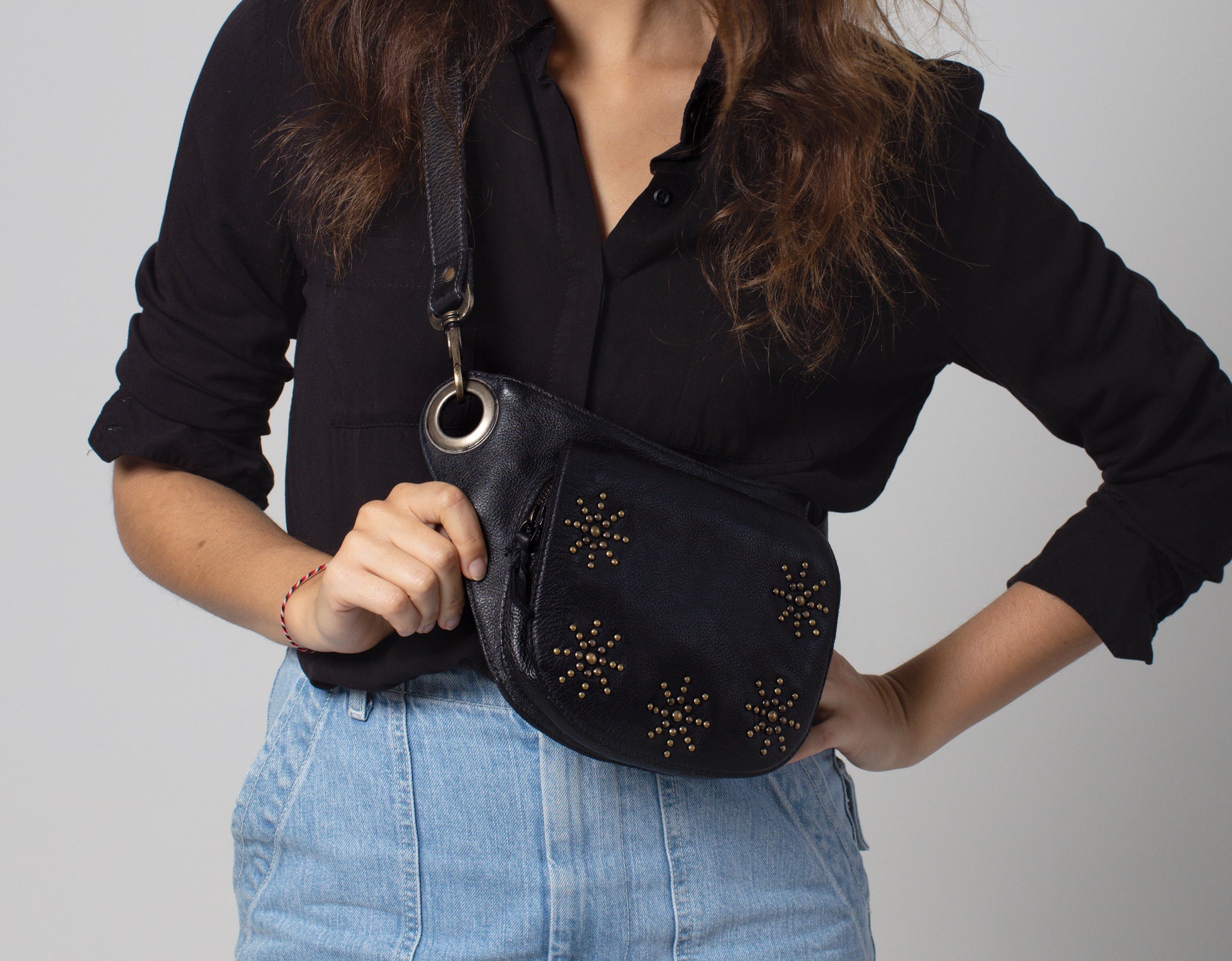 Black leather sling bag with a sleek, structured design and brass star details. Contemporary, secure, and made for travel or city life in style.
