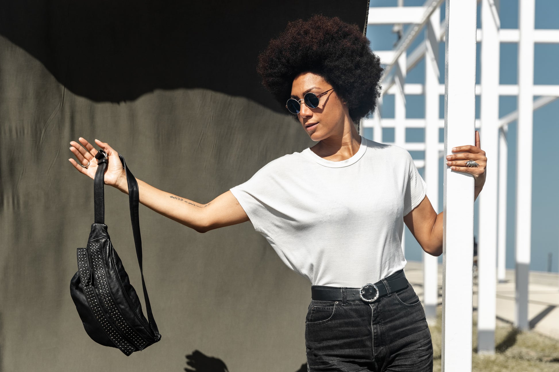 Small black leather sling bag with metallic studs for a bold, modern look. Compact, soft, and perfect for concerts, city life, or daily wear.
