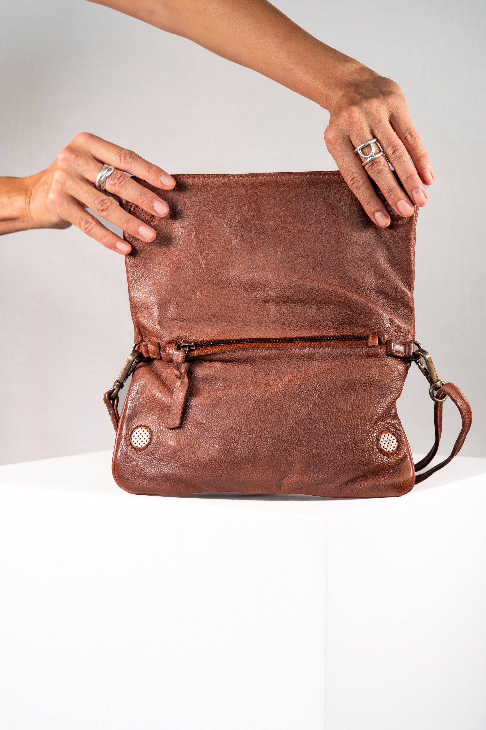 – Short brass chain and detachable long leather strap.